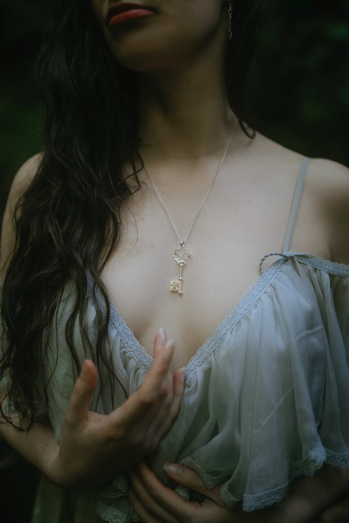 Gothic Key Large Gemstone Pendant Necklace with Black Spinel